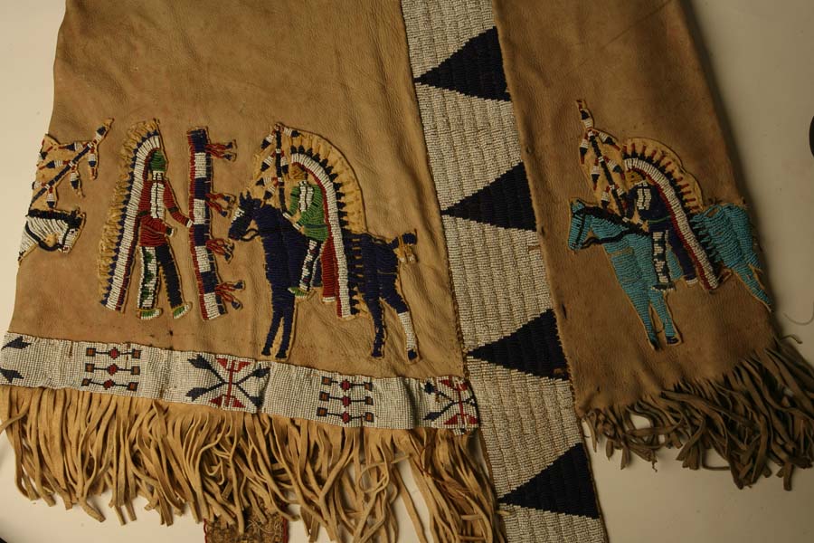 Description: Pastiche of several beadwork items, intricately decorated with horse and human images in various colors; may have been put together as a dramatic costume; Lakota ca. 1900.