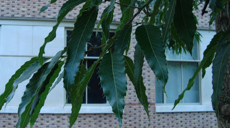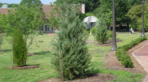 Approaching the south side of the building from the west, look for a group of trees against the west facade: a Japanese cedar (Cryptomeria japonica), blue Atlas cedar (Cedrus atlantica), deodar cedar (Cedrus deodara), and sawtooth oak (Quercus acutissima). It’s interesting to note that "cedar" is a common name applied to many trees that aren’t closely related scientifically.