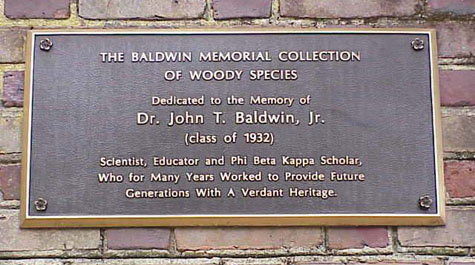 Behind the statue, the brick wall of the southwest stairs holds a plaque honoring Professor Baldwin’s many contributions. His vision helped transform the College’s campus into a living archive of woody plant species.