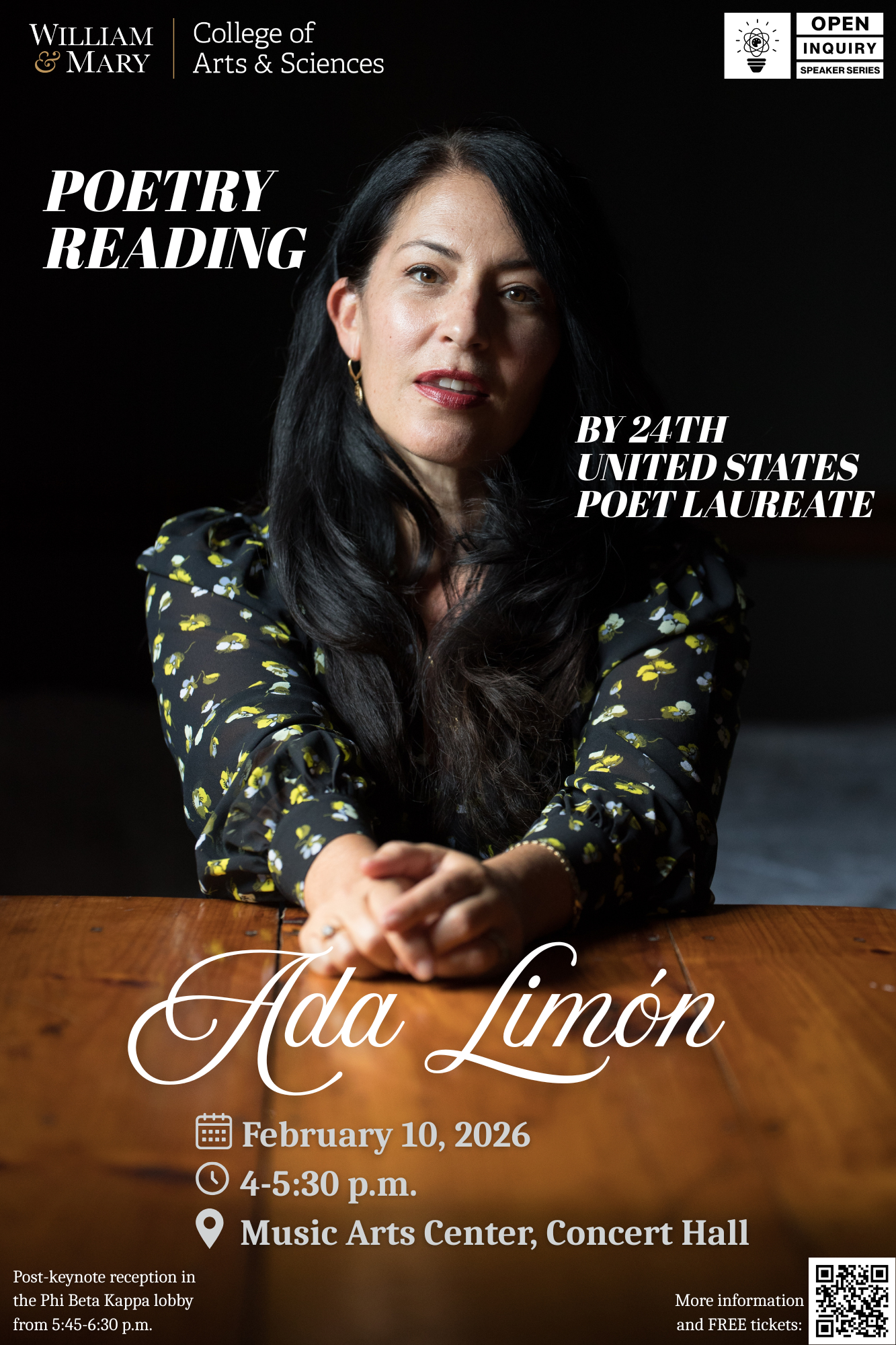 Before the poetry reading at 4 p.m. in the Concert Hall of the Music Arts Center, Limón will lead a poetry workshop open to the W&M community from 10-11:15 a.m.