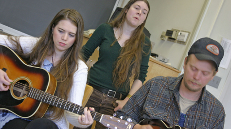 The master class was conducted by well-known Virginia folk group the Whitetop Mountain Band who came to William & Mary as part of the Ewell Concert Series in February. A family-based acoustic band originating in the 1940s from the mountains of Virginia, the Whitetop Mountain Band's repertoire features old-time fiddling and banjo picking, bluegrass, ballads, mountain gospel songs, and flatfoot dancing. Band members include Thornton Spencer (fiddle), Emily Spencer (vocals and banjo), Martha Spencer (guitar, vocals and dance); Jackson Cunningham (Mandolin) and Debbie Bramer (Bass and dance).