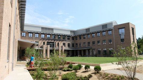 Behind the building is a courtyard and covered portico area as well as a pathway that will allow students and faculty to walk from the main campus - near the recreation center - to the new facility.