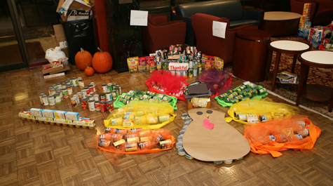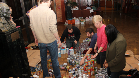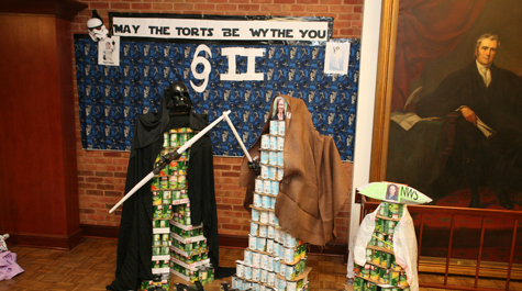 During the competition, first-year students representing sections of the Legal Practice Program create displays from a wide variety of canned and boxed foods, everything from creamed corn to green beans to stuffing mix and more. The idea is to engineer an inspiring display and collect the most amount of food items.