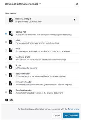 In addition to providing instructors with insight into their course accessibility, Ally automatically creates alternative versions of files. This allows students to choose the type of file that best suits their needs. Discover what alternate formats are available.
