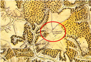During the 1781 Yorktown campaign, French officer Jean-Nicholas Desandrouins drafted a map of the Williamsburg area. Keeping in mind that north is to the left, the main road that runs diagonally from lower left to upper right is probably the predecessor of present Quarterpath Road. The Site 44JC0969 quarter area is probably represented by the structure (black dot) next to the woods across the road from the larger complex labeled Southalls Quarter.By 1771 Southall had ended his lease at Wetherburn's and purchased the Raleigh Tavern from the estate of Anthony Hay. The Raleigh Tavern would remain under his ownership for 30 years, until he died in 1801. According to the advertisement Hay placed in the Virginia Gazette in 1771, Southall's purchase from Hay included the tavern with a "stable and pasture adjoining." Writing a history of the tavern in 1932, Colonial Williamsburg historian Helen Bullock mentioned that Southall had acquired 19 slaves and "a distant stable and pasture," though she cited no reference for this statement (Bullock 1932:4). The earliest known textual reference in the primary records to Southall's association with a quarter in James City County is an advertisement he placed in the Gazette in 1780 offering his stallion Traveller for stud at his "plantation near Williamsburg." The next year, 1781, when French officer Jean-Nicholas Desandrouins made his map of the landscape around Williamsburg, the spot that corresponds to Site 44JC0969 was part of a larger farmstead complex labeled as "Southall's Quarter." By the time of the earliest existing land tax records in 1782, Southall was listed as owning 920 acres in James City County. This is the only property listed for James Southall in the county, and combined with the other more indirect references, it is highly likely that it corresponds to the area labeled as "Southall's Quarter" on the map made the previous year.